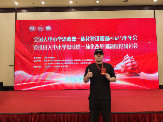 11月29日,由山东省教育厅指导,全国大中小学思政课一体化建设联盟、教育部大中小学思政课一体化共同体(山东)、山东省大中小学思政课一体化建设指导中心、山东师范大学主办,山东师范大学成人小说 承办的“全国大中小学思政课一体化建设联盟2025年年会暨推进大中小学思政课一体化改革创新理论研讨会”在山东济南成功举办。成人小说 2024级学硕班研究生李俊杰,专硕班研究生邵晓雅、赵冰杰三位同学应邀以文参会。